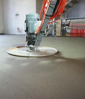 На следующем этапе по основанию распределяется необходимое количество цементно-песчаной смеси. Для ее выравнивания используется правило. Во избежание образования трещин нарезаются деформационные швы. После высыхания раствора специальной затирочной машиной проводится шлифовка поверхности.